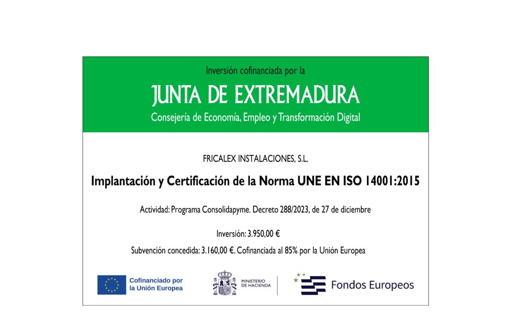La empresa Fricalex Instalaciones S.L. informa a través de su página web del apoyo financiero recibido por parte de la Unión Europea para la ejecución de un programa destinado a mejorar la eficiencia energética y reducir el impacto ambiental de su actividad. En el marco de su compromiso con la sostenibilidad y la protección del medio ambiente, se ha llevado a cabo la Implantación y Certificación de la Norma UNE EN ISO 14001:2015 que permitirá reducir su impacto ambiental, mejorar el uso de recursos y prevenir la contaminación.