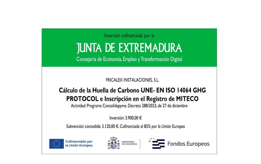 La empresa Fricalex Instalaciones S.L. informa a través de su página web del apoyo financiero recibido por parte de la Unión Europea para la ejecución de un programa destinado a mejorar la eficiencia energética y reducir el impacto ambiental de su actividad. En el marco de su compromiso con la sostenibilidad y la protección del medio ambiente, se ha llevado a cabo la Cálculo de la Huella de Carbono UNE- EN ISO 14064 GHG PROTOCOL e Inscripción en el Registro de MITECO que permitirá reducir su impacto ambiental, mejorar el uso de recursos y prevenir la contaminación.